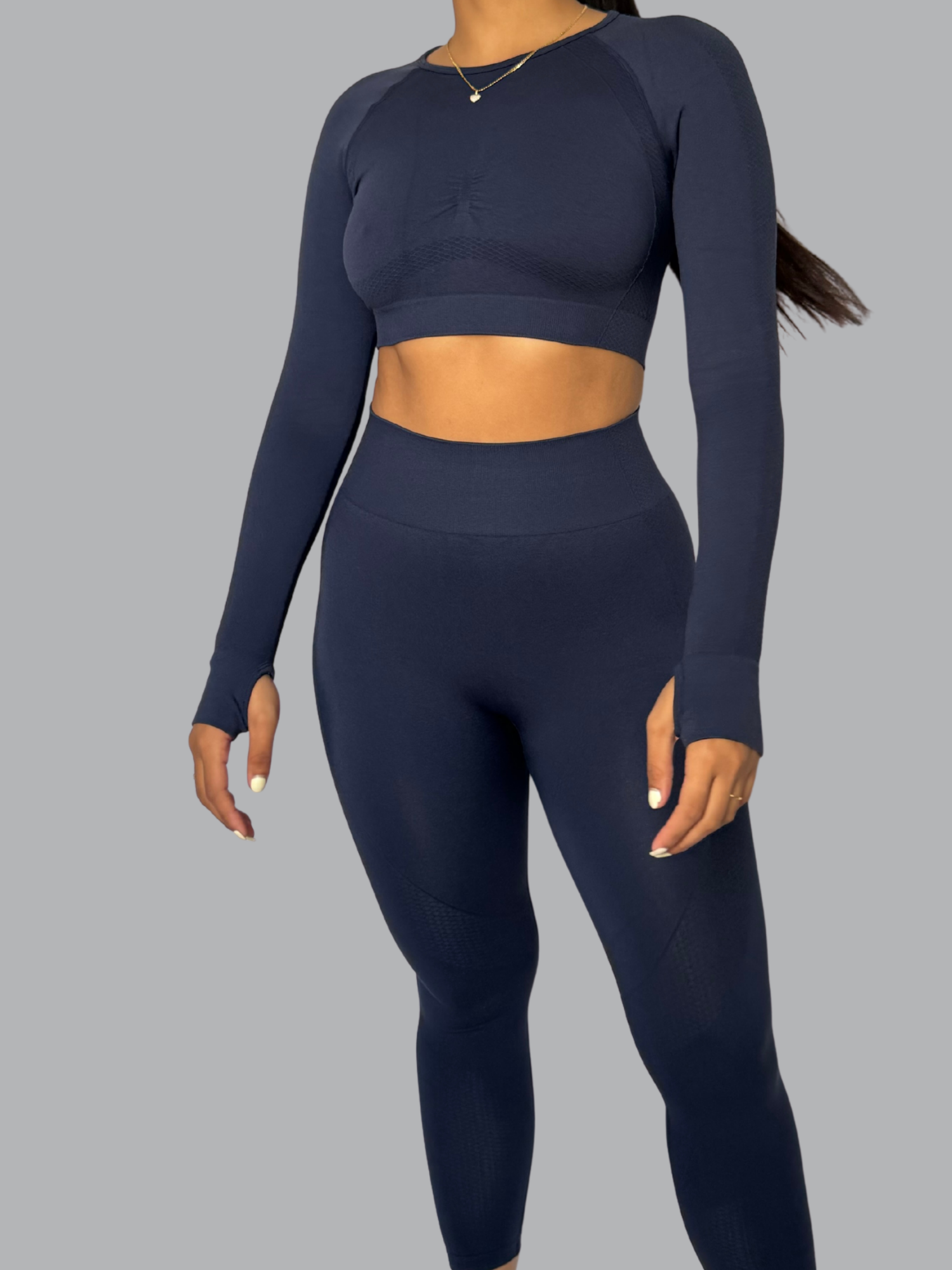 Este set seamless push up resalta tu figura con un diseño que moldea glúteos y define la cintura. Su top de manga larga con abertura en la espalda le da un toque moderno y femenino, mientras que el legging de tiro alto ofrece control y soporte total. Es cómodo, elástico y perfecto para entrenar o crear looks deportivos con estilo.