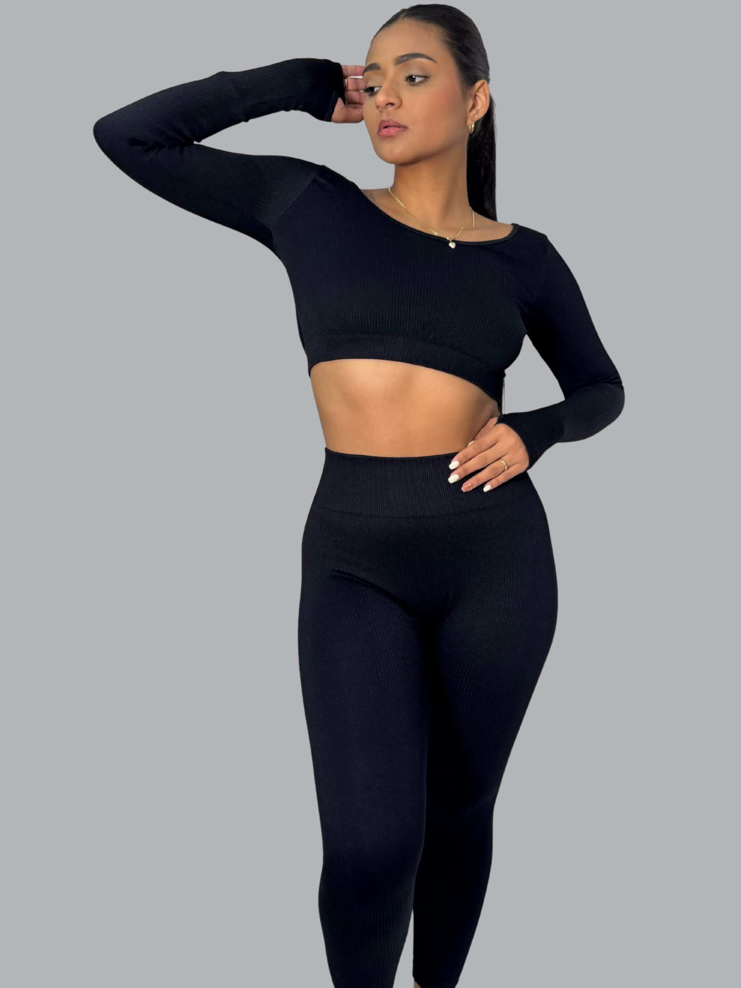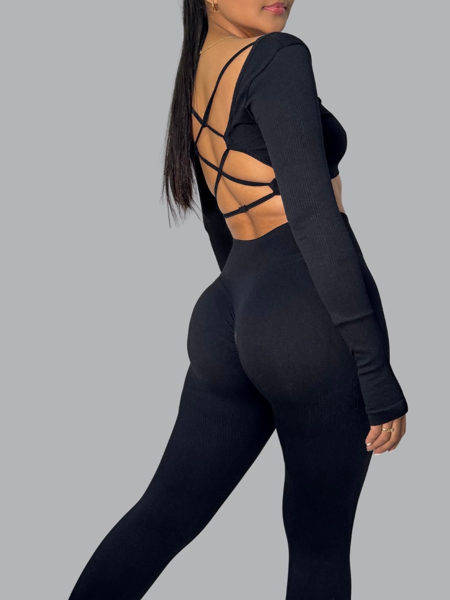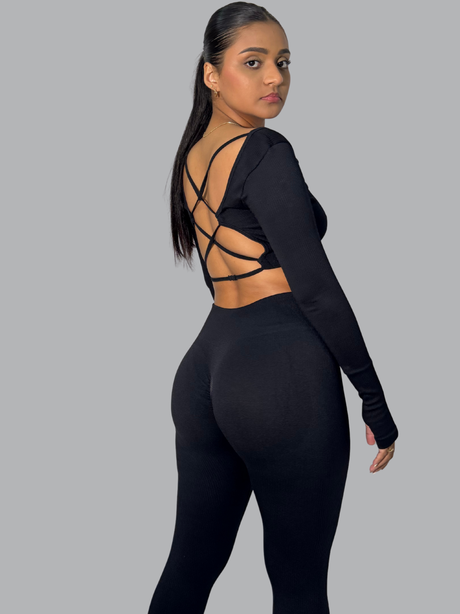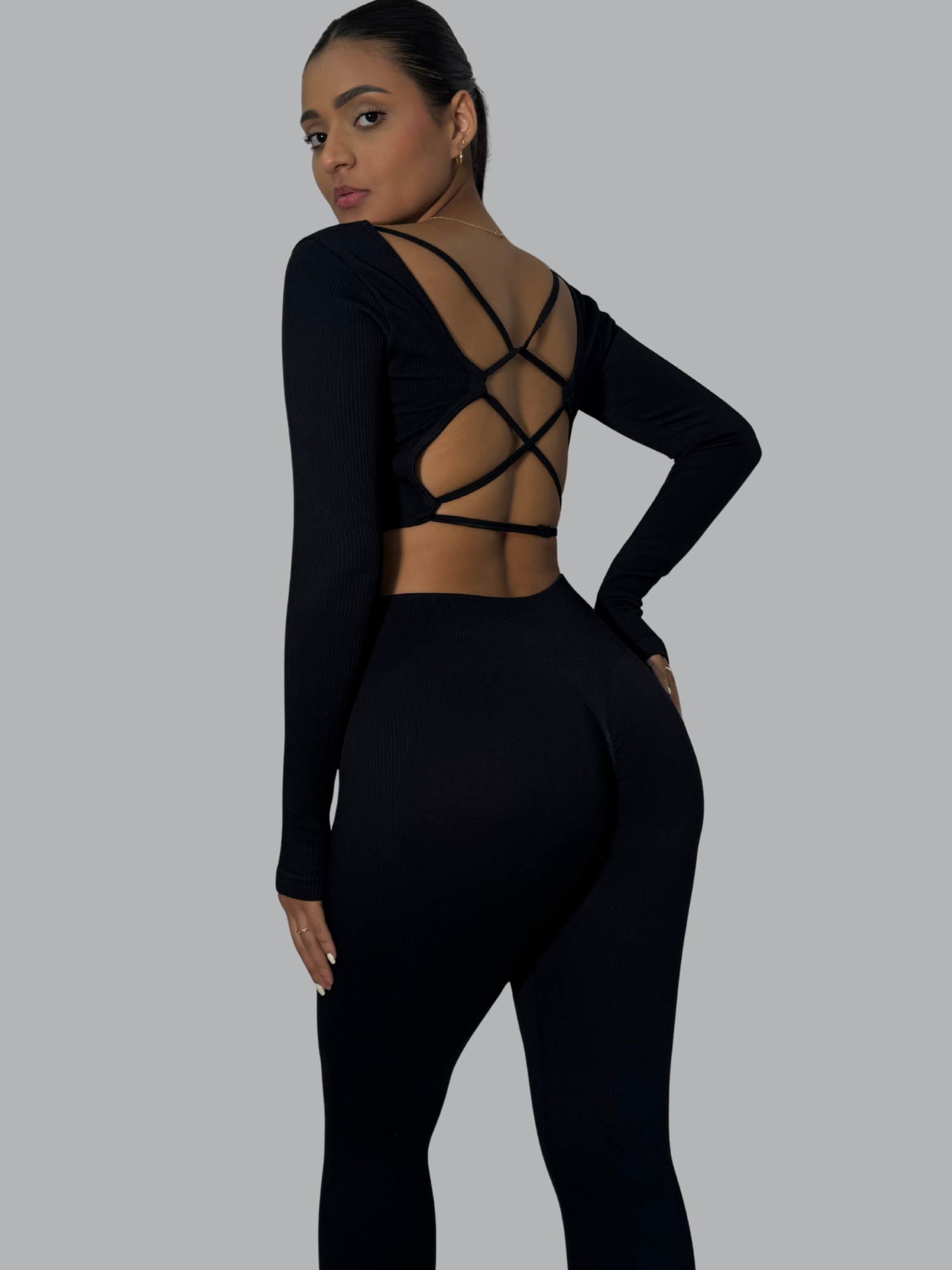 Este set push up realza tu figura con un diseño que combina sensualidad y soporte. Su top de manga larga con tiras cruzadas en la espalda aporta un toque moderno y atrevido, mientras que el legging de tiro alto moldea glúteos y cintura con efecto push up. Su tejido elástico y cómodo se adapta al cuerpo.