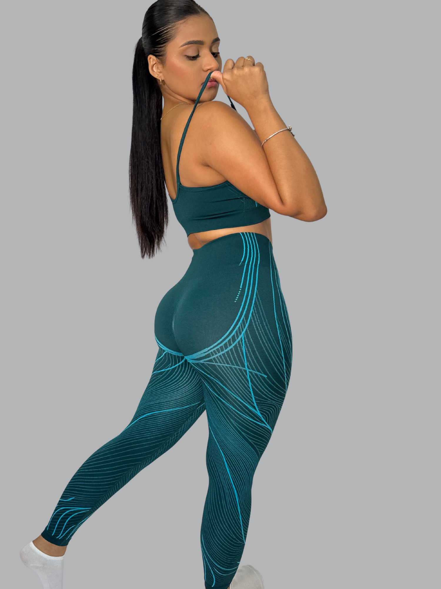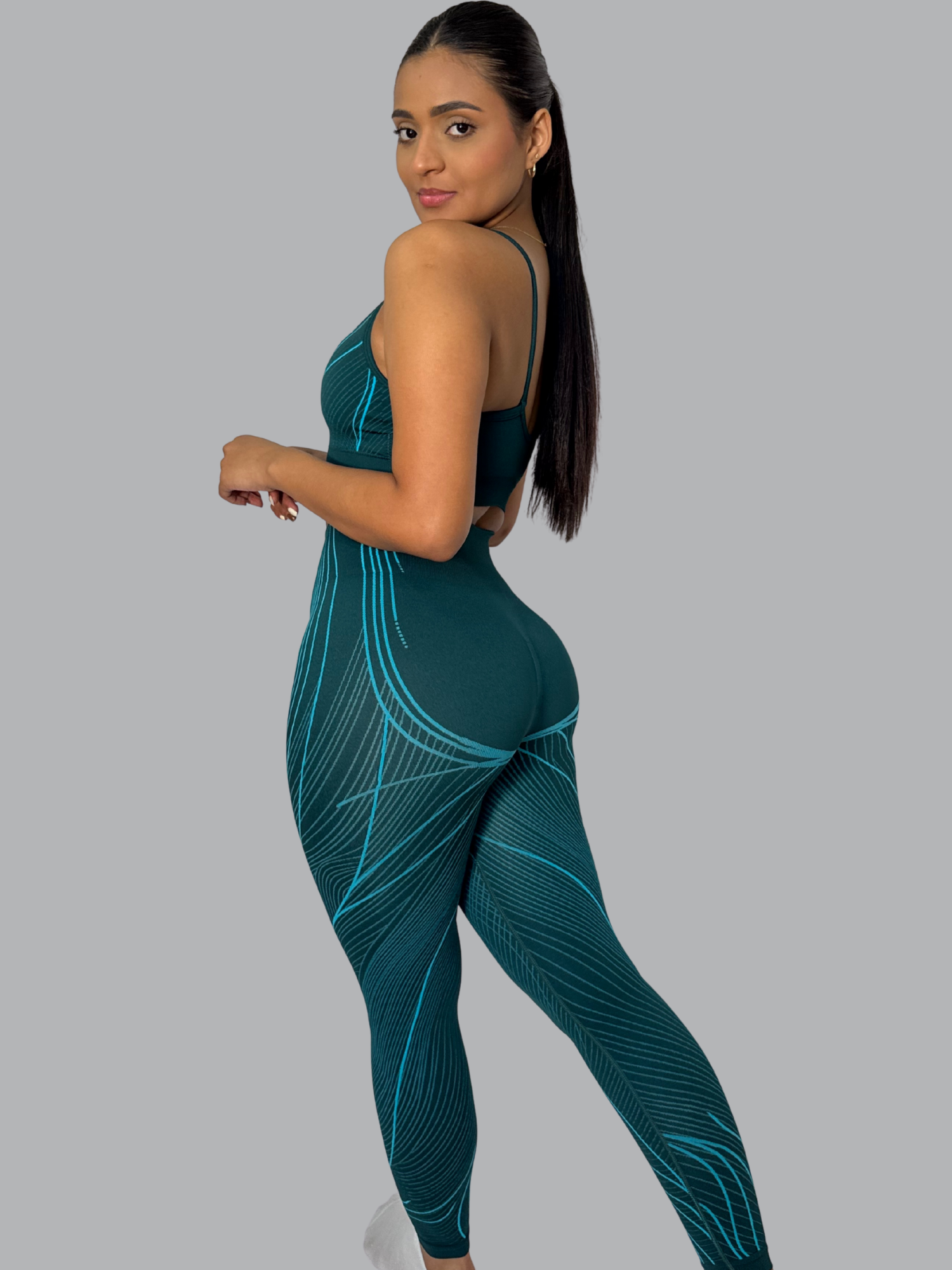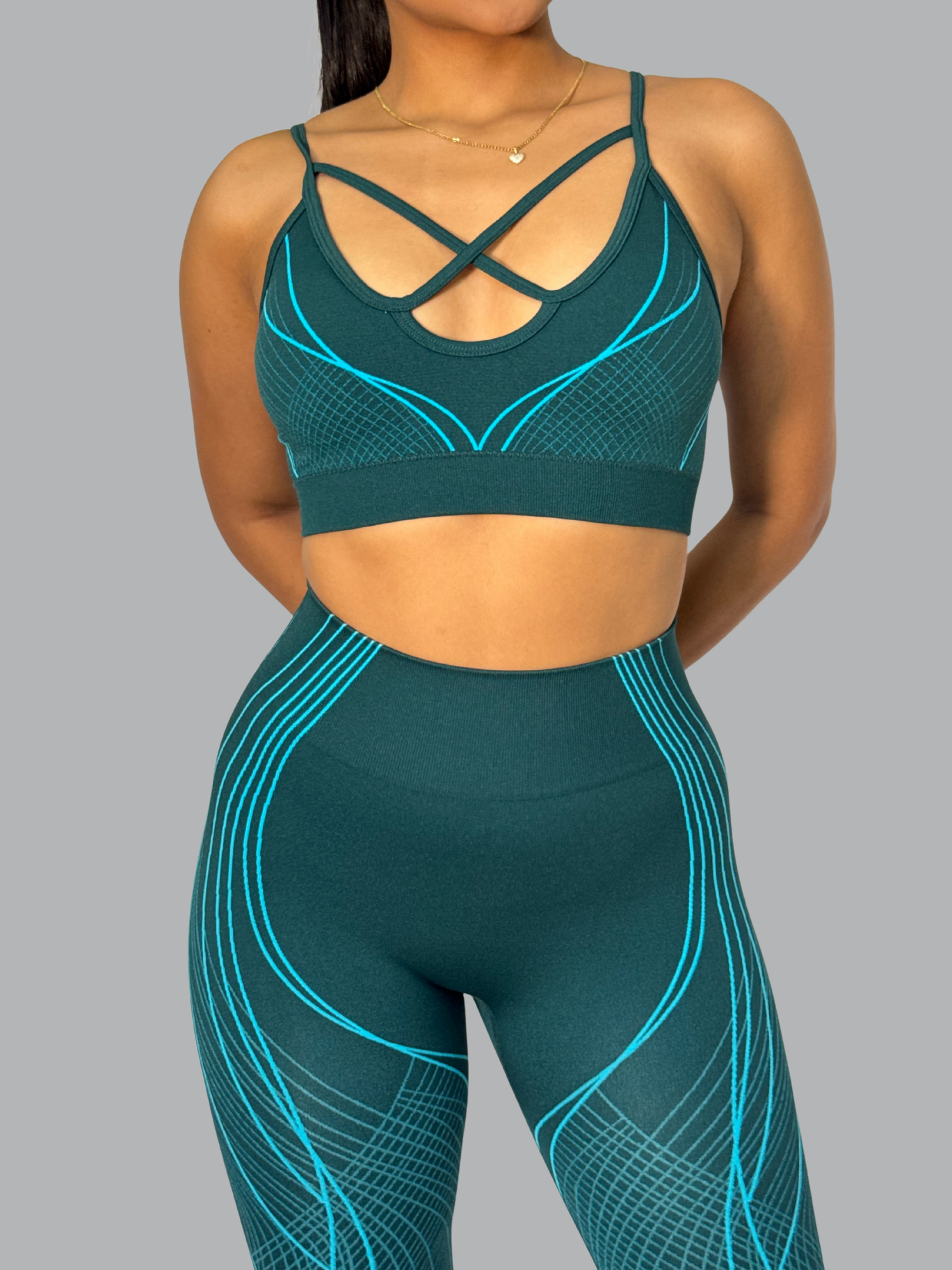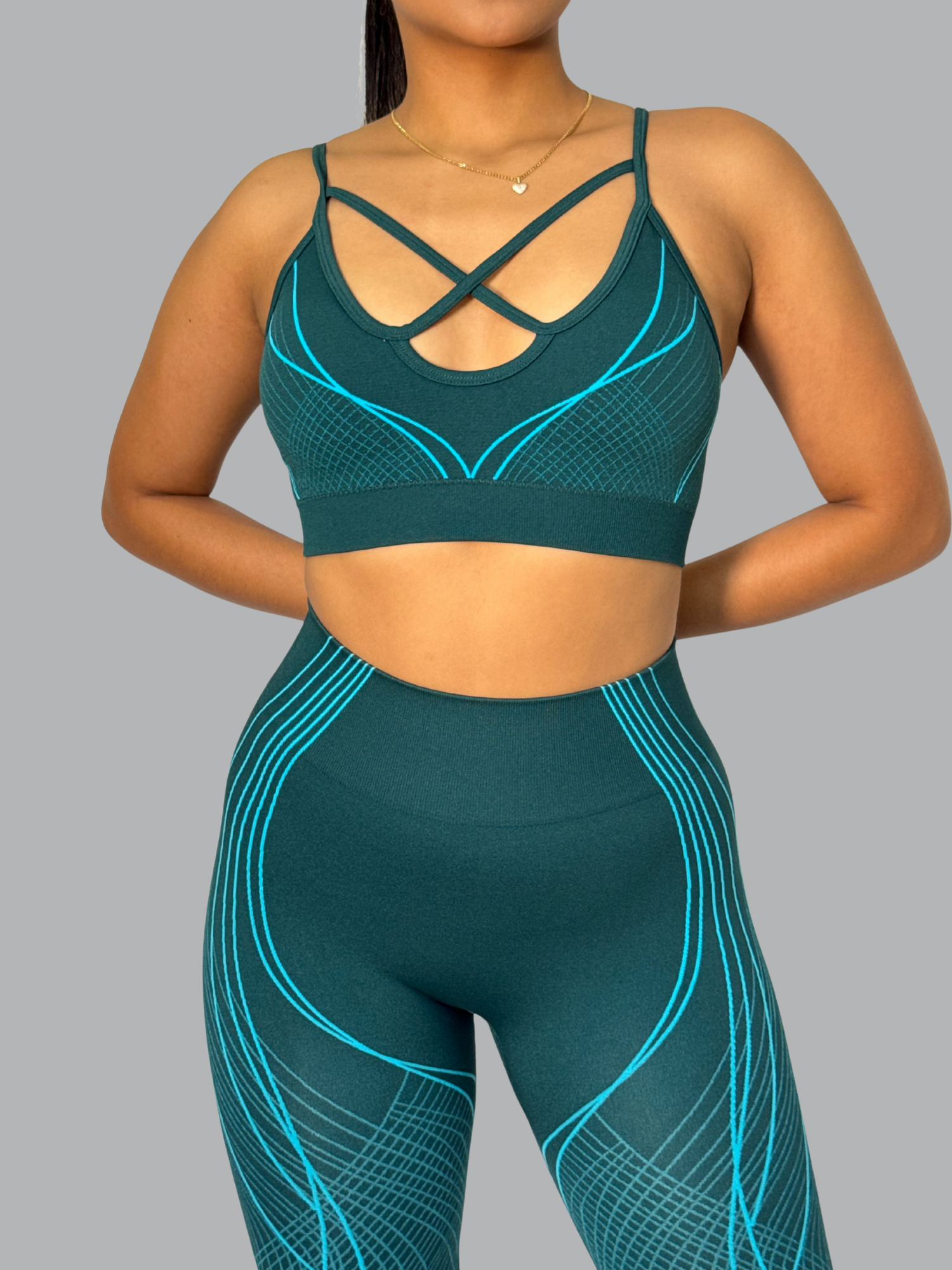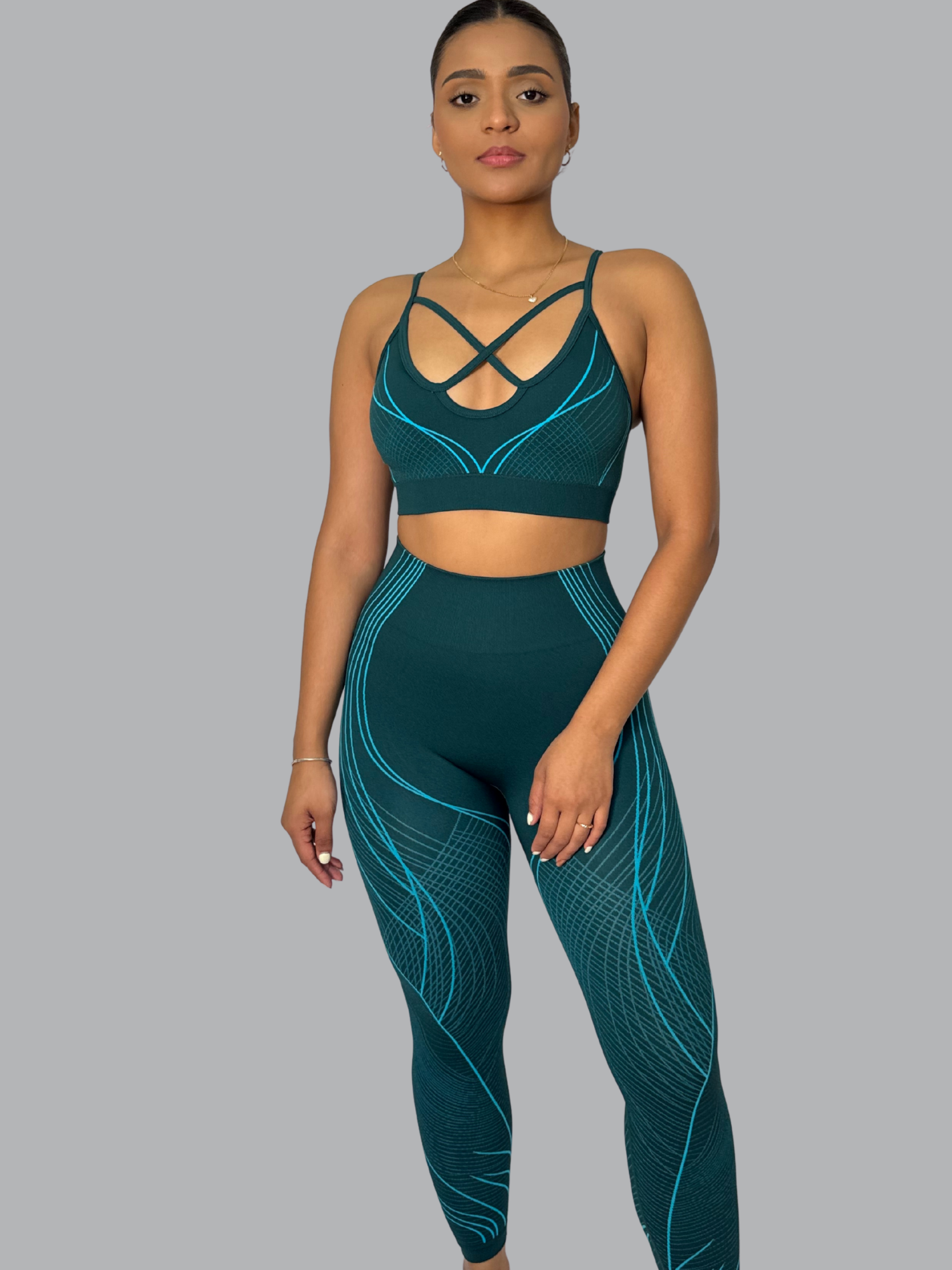 Este set push up combina diseño y funcionalidad para resaltar tu figura con estilo. Su top con tiras cruzadas ofrece un ajuste seguro y favorecedor, mientras que el legging de tiro alto moldea glúteos y cintura, brindando soporte y realce natural. El tejido seamless con detalles en líneas aporta un toque moderno y sofisticado, ideal para entrenar.